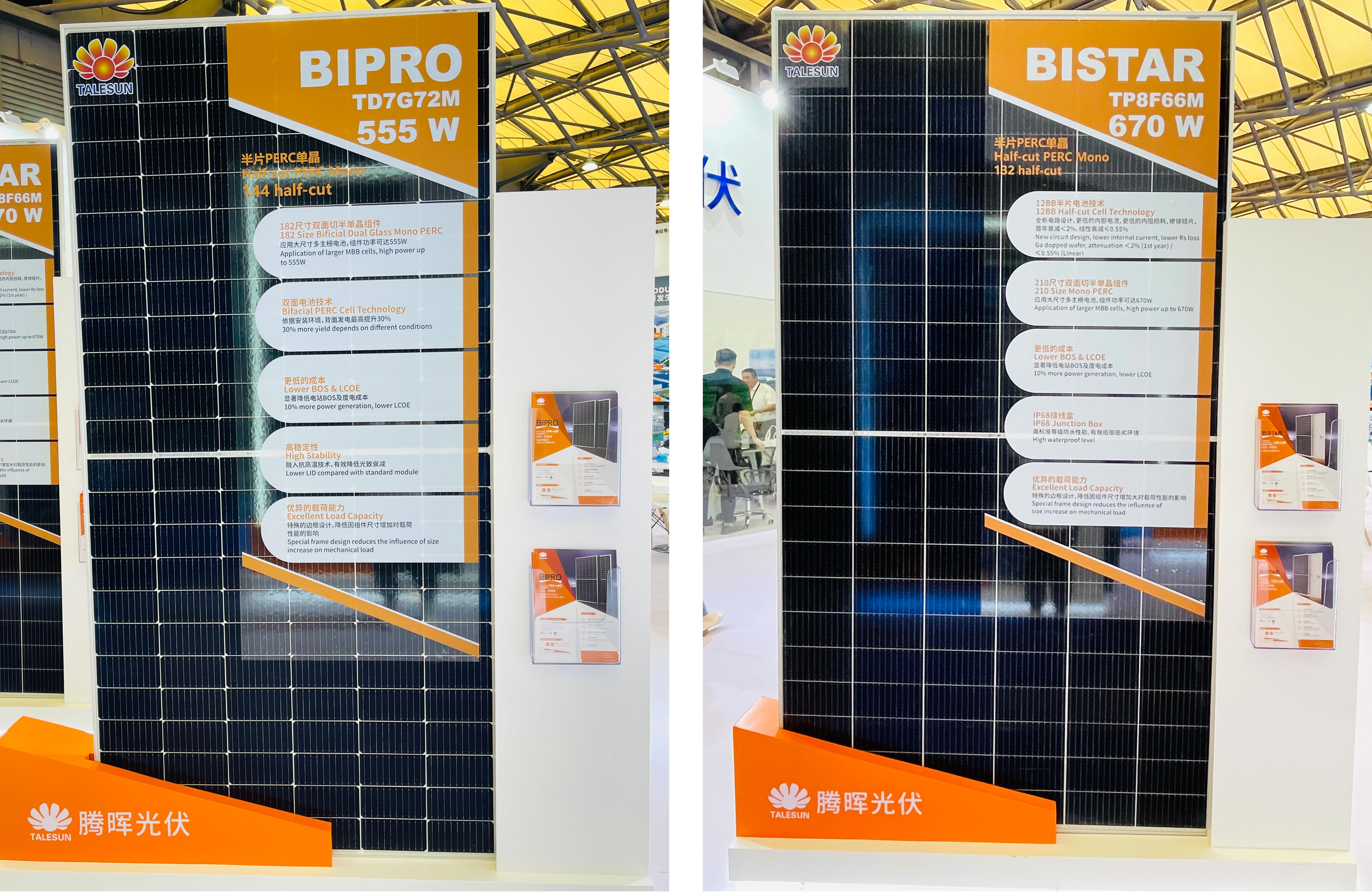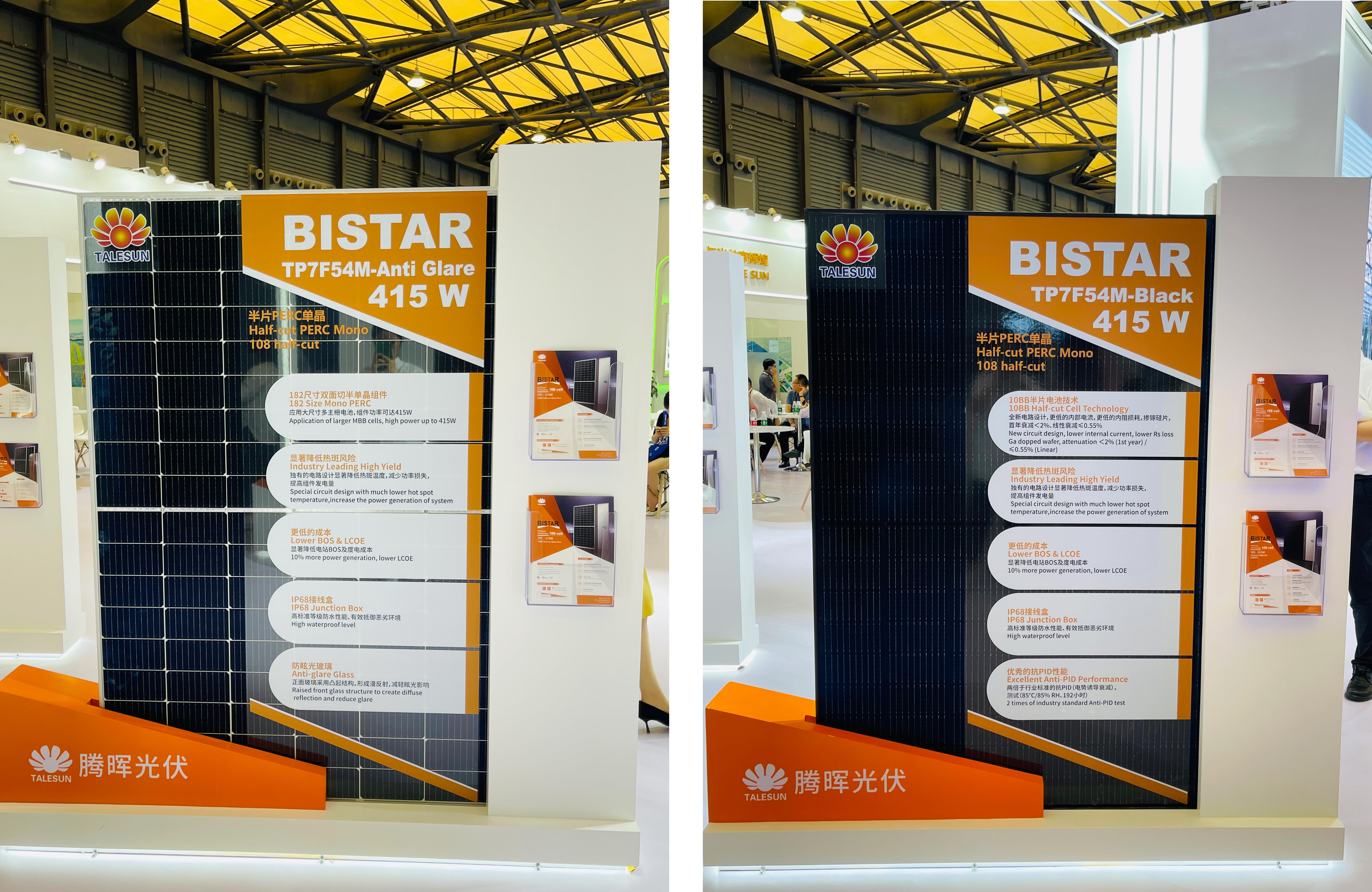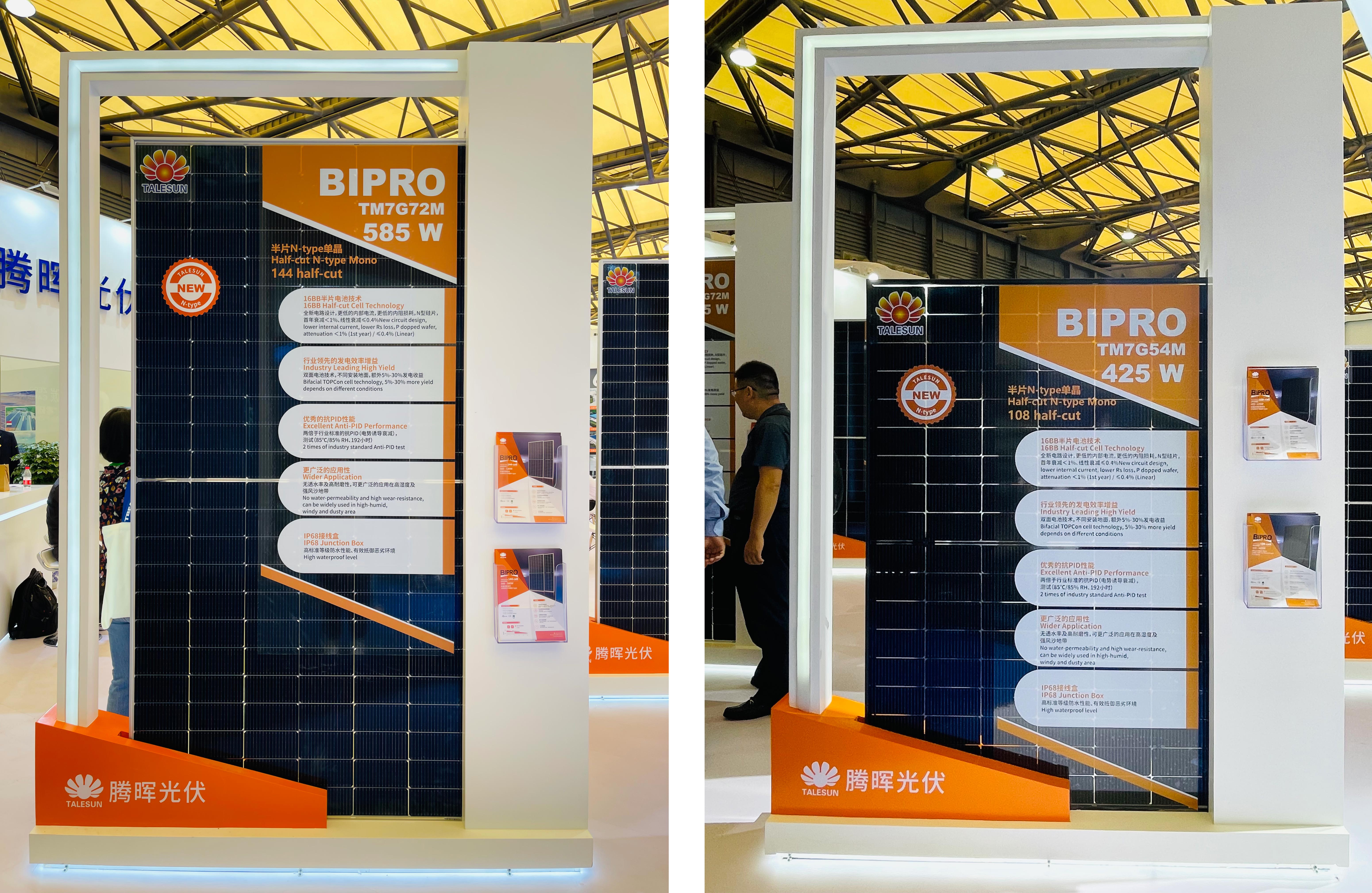 位于 E1-530 展臺(tái)的騰暉光伏,首次攜 N 型組件在國(guó)內(nèi)亮相,正式宣布進(jìn)入“N”時(shí)代。此次展出兩款組件分別為:BIPRO_TM7G72M BIPRO_TM7G54M。由于 N 型組件更低的溫度系數(shù)、更高的雙面率、更低光致衰減等方面的發(fā)電性能優(yōu)勢(shì),比起常規(guī) P 型組件來(lái)說(shuō)在相同直流側(cè)容量下帶來(lái)至少 3%的發(fā)電量增益。同時(shí),N 型組件由于更高的轉(zhuǎn)換效率,相應(yīng)降低了所吸收光能的熱轉(zhuǎn)換,從而降低了組件的工作溫度。因此,在提升發(fā)電量的同時(shí),發(fā)電回報(bào)更高、應(yīng)用環(huán)境更廣、更受客戶(hù)青睞。