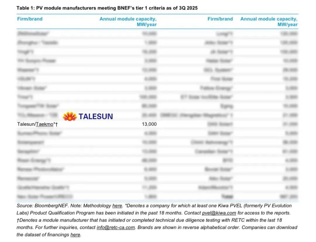 Recently, the globally renowned energy research institution BloombergNEF (BNEF) released its Q3 2025 photovoltaic module manufacturer rating list. Talesun, with its outstanding product quality, robust financial performance, and strong global market competitiveness, has once again been recognized as a Tier 1 module manufacturer for Q3 2025.